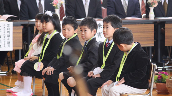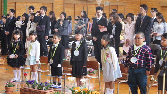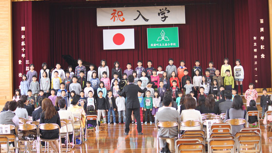 本年度は13名の子どもたちが入学してきました。6年生に手を引かれながら、緊張しての入場です。全校児童による合唱「みなみ」でお祝いしました。