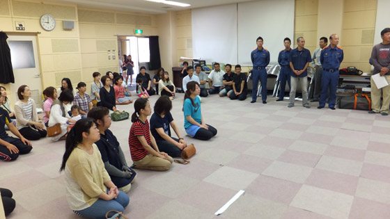 消防士の方に、人工呼吸や心臓マッサージのお手本を見せていただきました。
