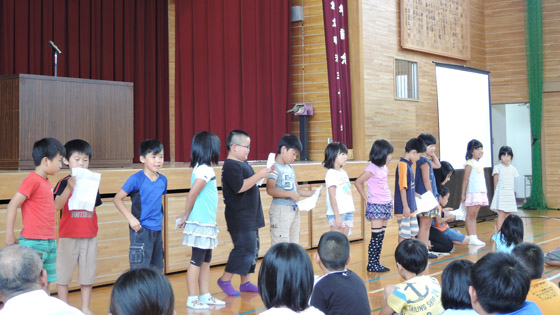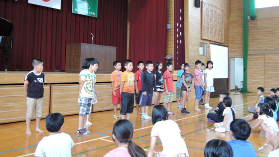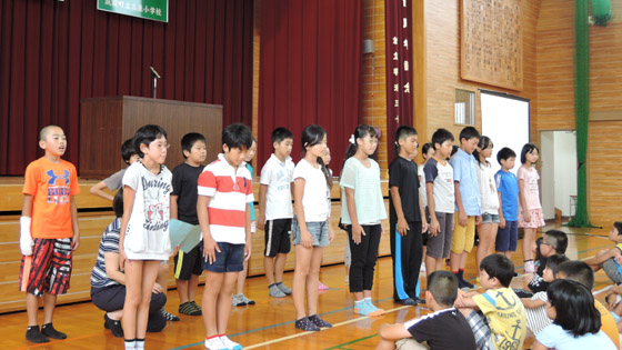 台風の影響で1日早い終業式となりました。三並小の終業式では校長先生のお話や1学期の反省の他に、業間の「パワーアップタイム」で取り組んできた「音読」の発表を行います。