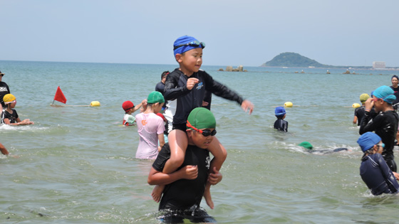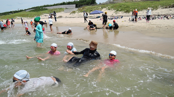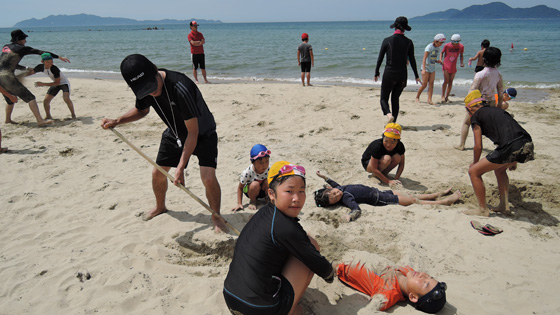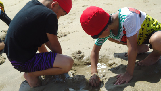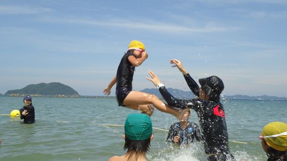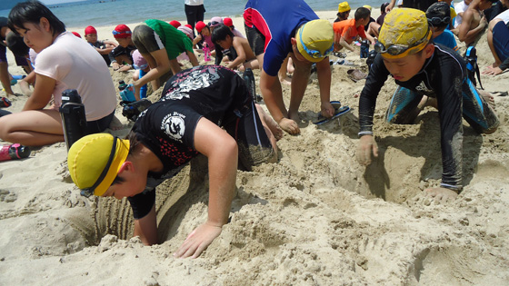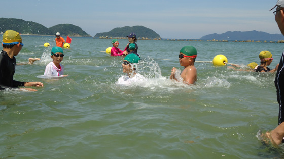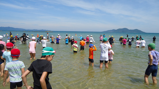 それまでの天気が嘘のように、当日は晴天に恵まれ絶好の海水浴日和でした。太陽が燦々と輝く中、子ども達はそれにも負けないぐらいの歓声を上げて「海」を満喫していました。