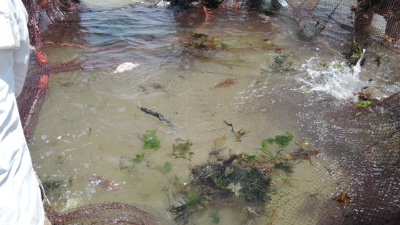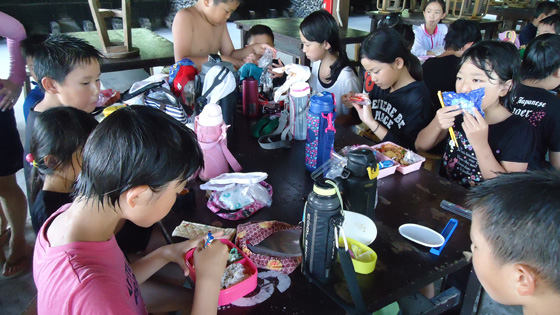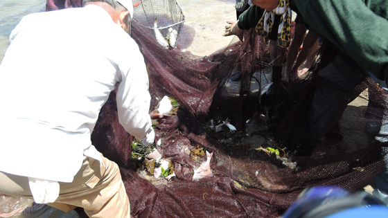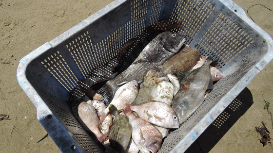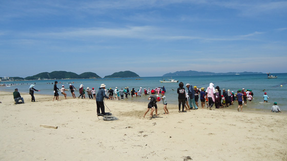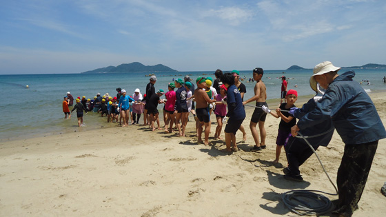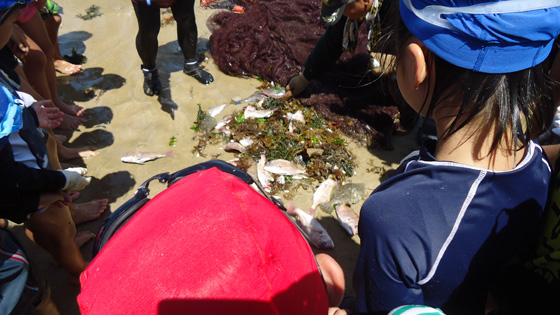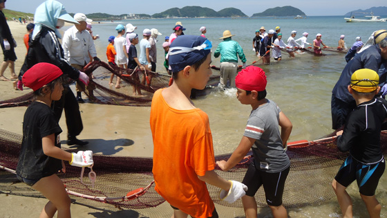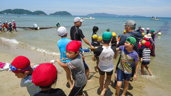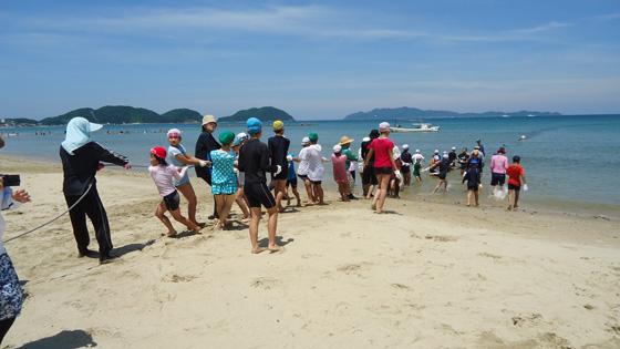 今年は、「地引き網」を取り入れました。地元の漁師さんにお願いして近くの砂浜にて行うことができました。二手に分かれた子ども達は、漁師さん達のかけ声に合わせ、大きな声を出して力の限り網を引いていました。そのおかげでたくさんの魚が捕れるとともに、忘れられない思い出として心に残りました。