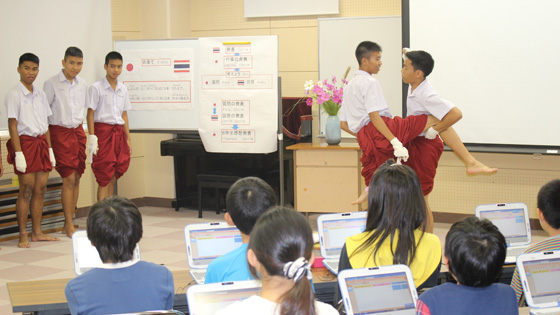 授業は、6年生からタイの高校生に衣食住や文化、遊びのことを深く質問し、それに高校生が答えるといった形式で行いました。6年生からの質問はタブレットパソコンに入力し、一括して画面に映し出しました。それを見ながら、タイの高校生もいっしょうけんめいに日本語やイラスト等を使って答えてくれました。特に、「ムエタイの実演」には6年生もその軽やかな動きに驚いていました。