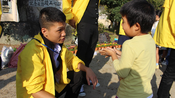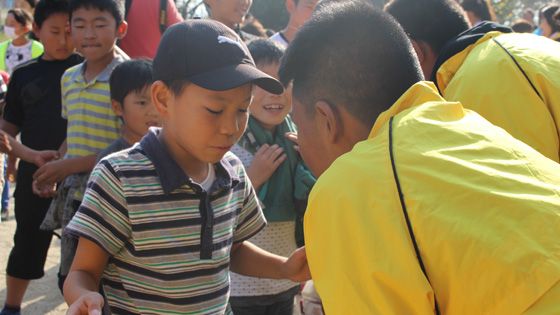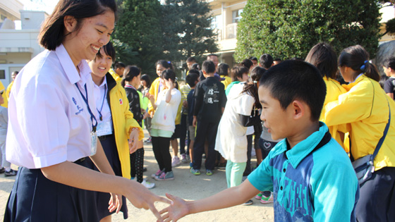 授業後、前庭で全校児童とも「自己紹介ゲーム」を行い交流しました。お互いにあいさつをして、「パウ・イン・チュッ=じゃんけんぽん」を行い、勝った方から自分の名前を相手に伝えるゲームです。最初は少々戸惑っていた児童ですが、タイの高校生も積極的に声をかけてくれて盛り上がり、時間が足りないくらいでした。