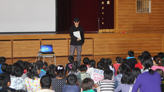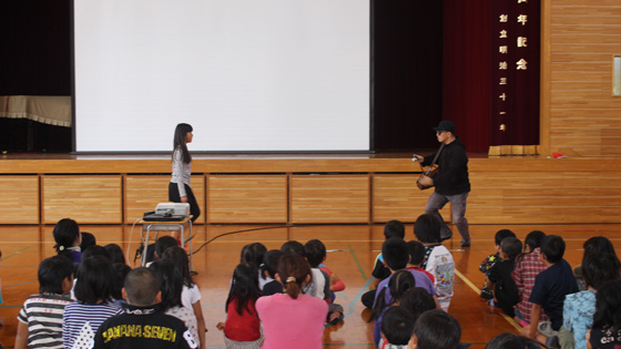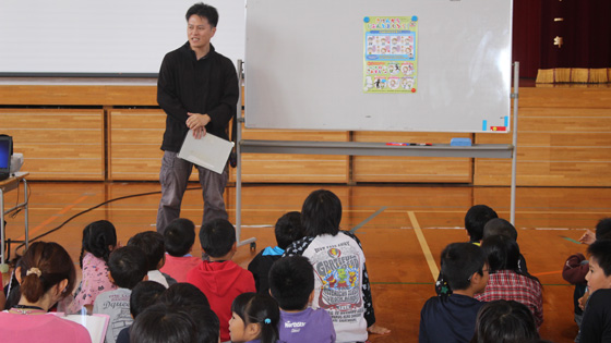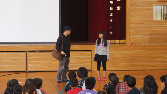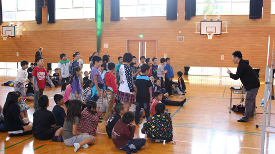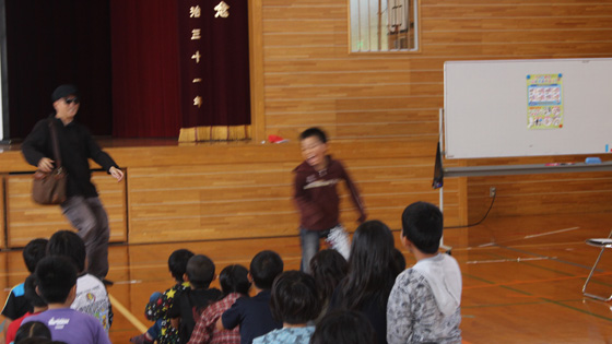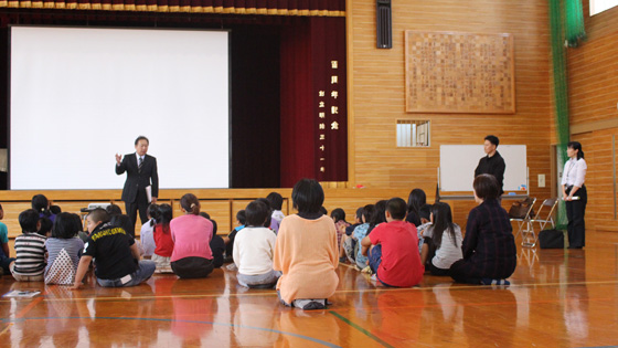 その後、警察署の方から不審者に出会ったときの注意点「いかのおすし」についてのお話や、大きな声の出し方の練習、さらには、不審者に出会った場面を再現した模擬訓練を児童にしていただきました。