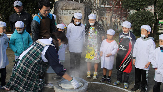 たてわり班でもちつきを行いましたが、6年生がリーダーとして、「つく」順番を決めたり、1年生を手助けしたりしてそれぞれの班をまとめ、みんなで協力して「おいしいおもち」を作ることができていました。