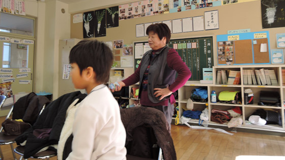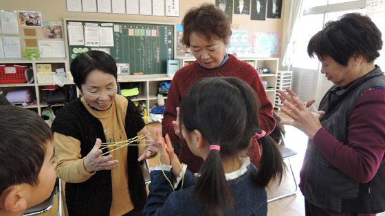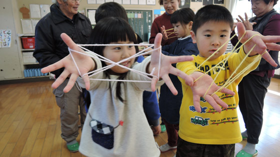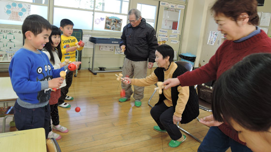 「地域の祖父母に昔の遊びを教えていただき、交流しながら楽しく一緒に遊ぶ」ことをねらいに行いました。4人の祖父母の方々に来ていただき、子ども達は楽しいひとときを一緒に過ごすことができました。