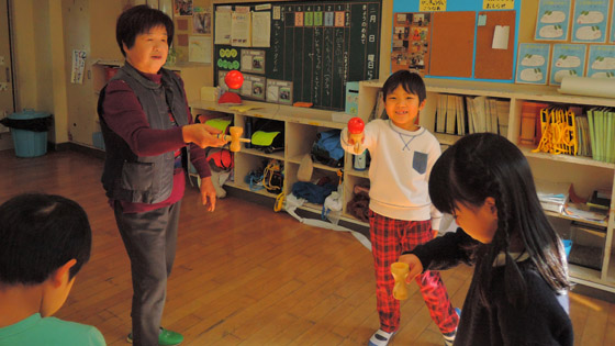 けん玉、お手玉、あやとり、竹トンボ、こま回し、はねつき…子ども達はどれも最初は手こずっていましたが、ていねいに教えていただき、