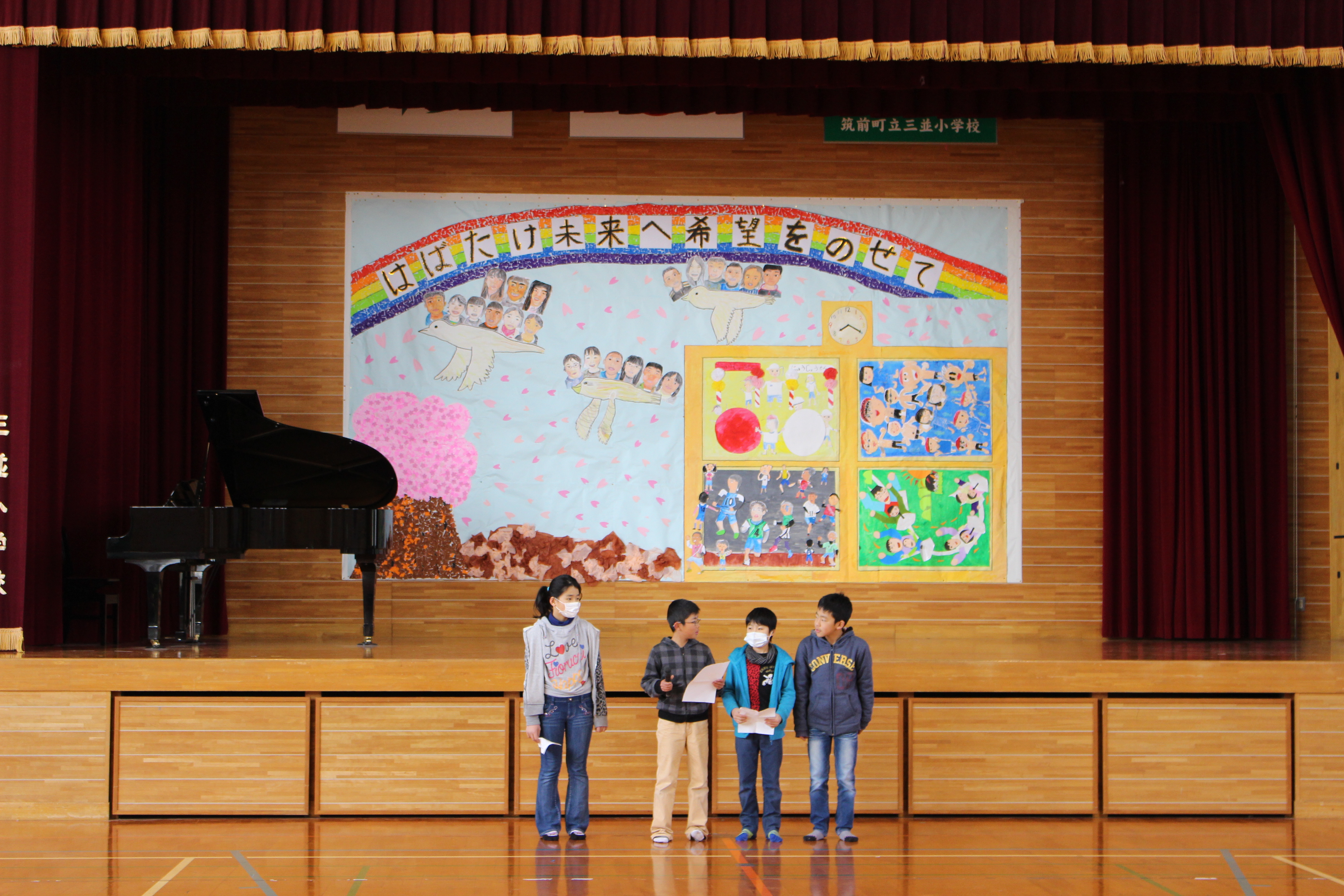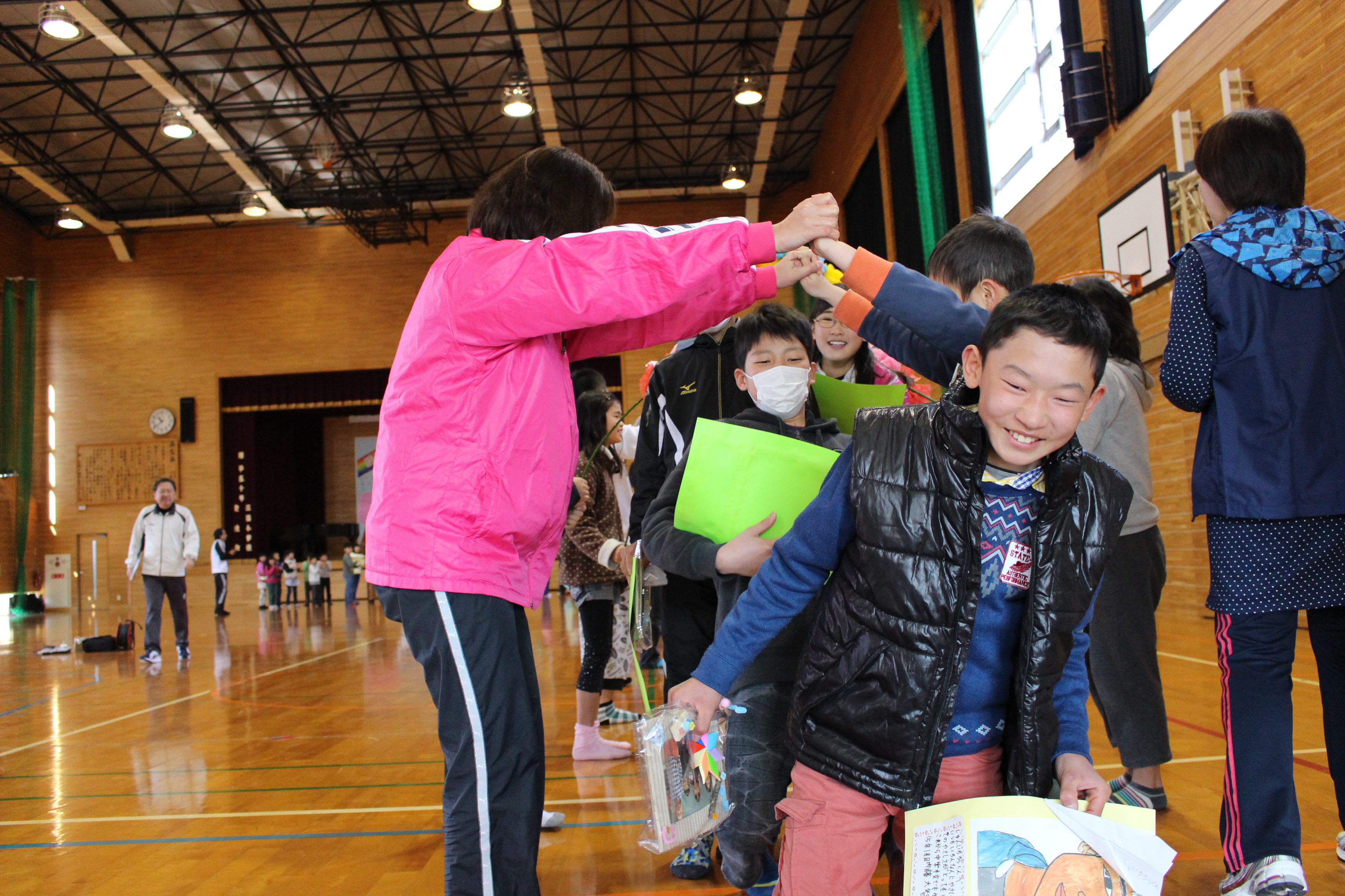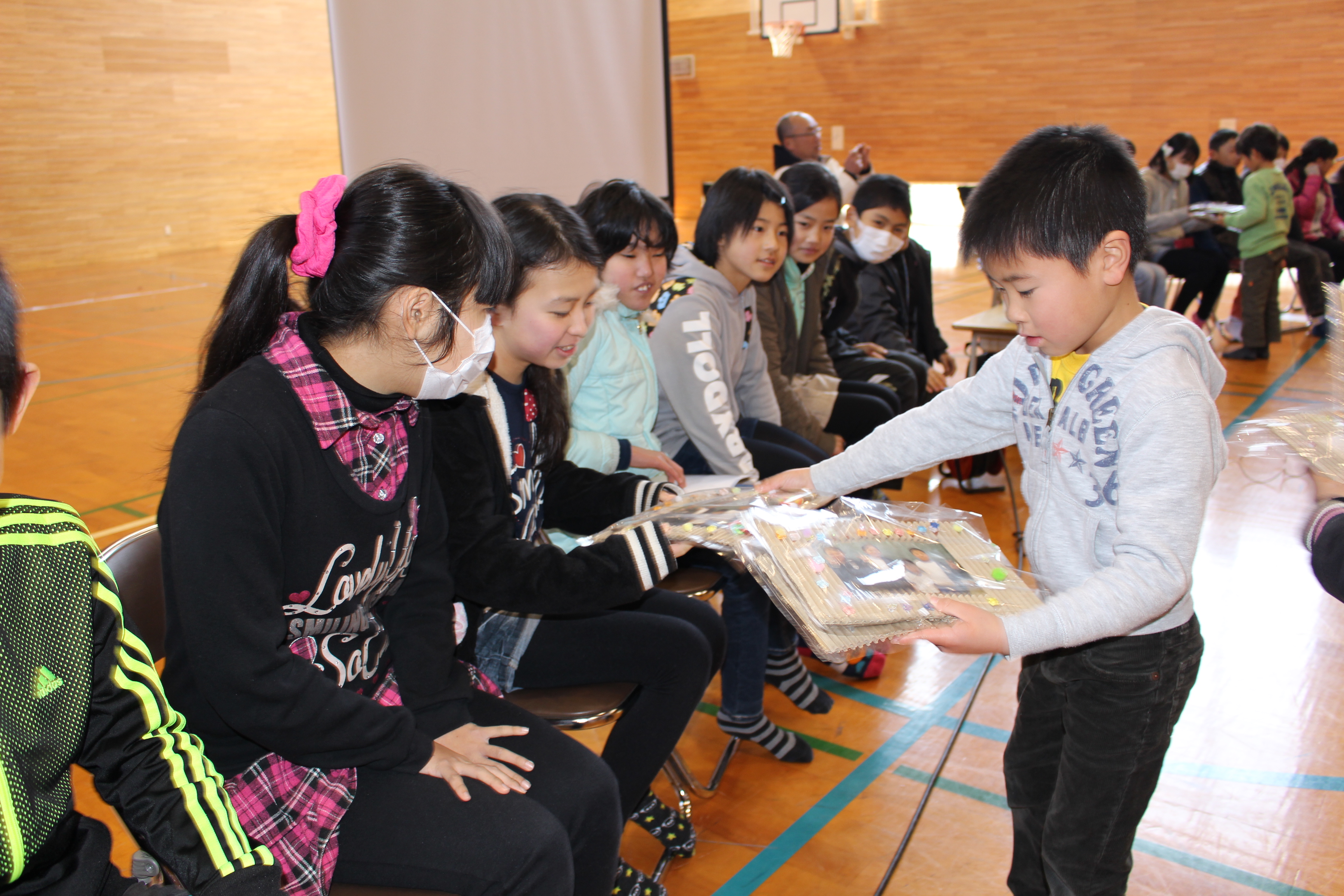集会では5年生が企画、準備、当日の進行等を立派に努め、集会を作り上げてくれました。各学年が工夫した「出し物」を披露した後、6年生に感謝の気持ちや応援メッセージ、プレゼントを贈ったり、6年生が一人ずつメッセージを伝えたりしました。