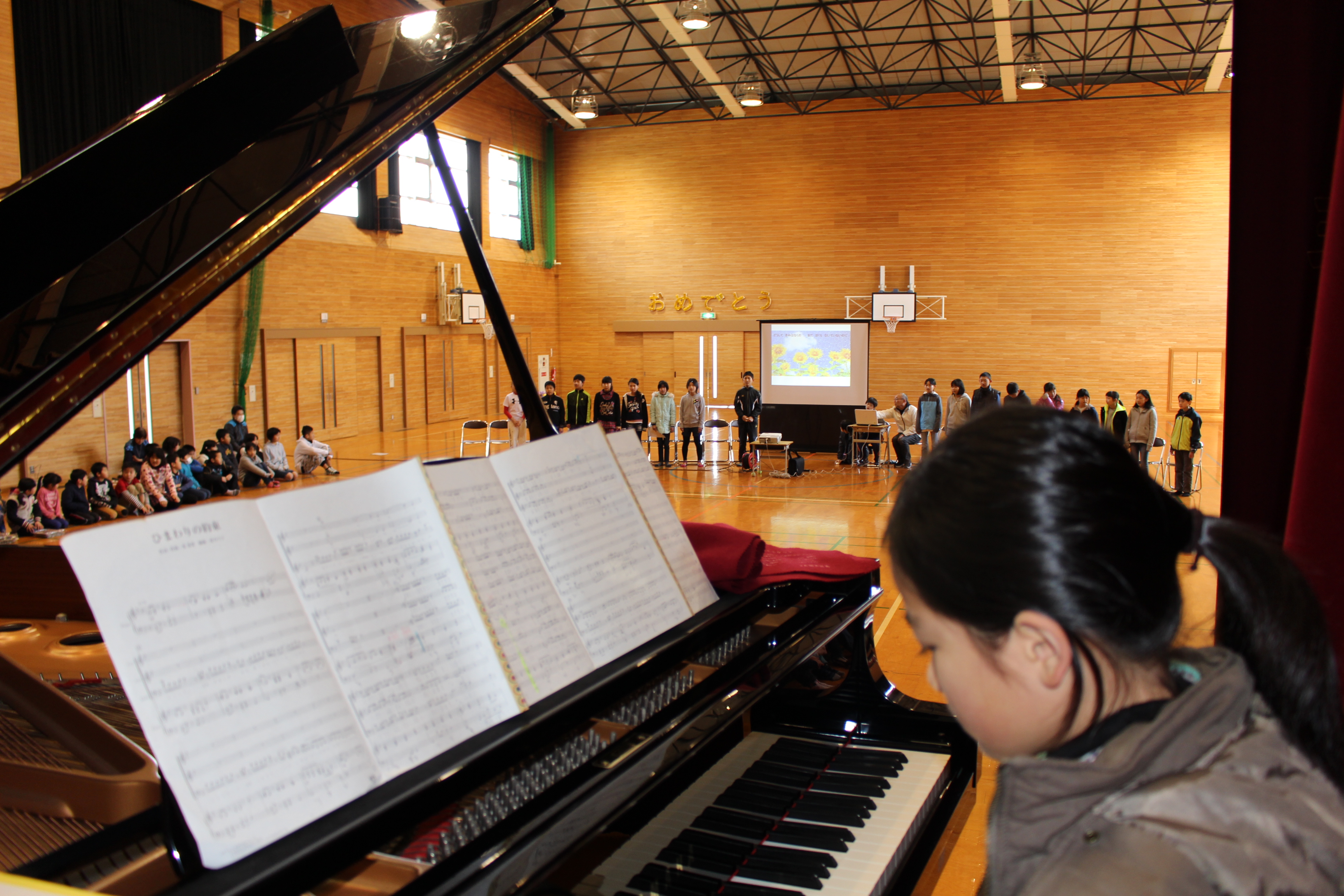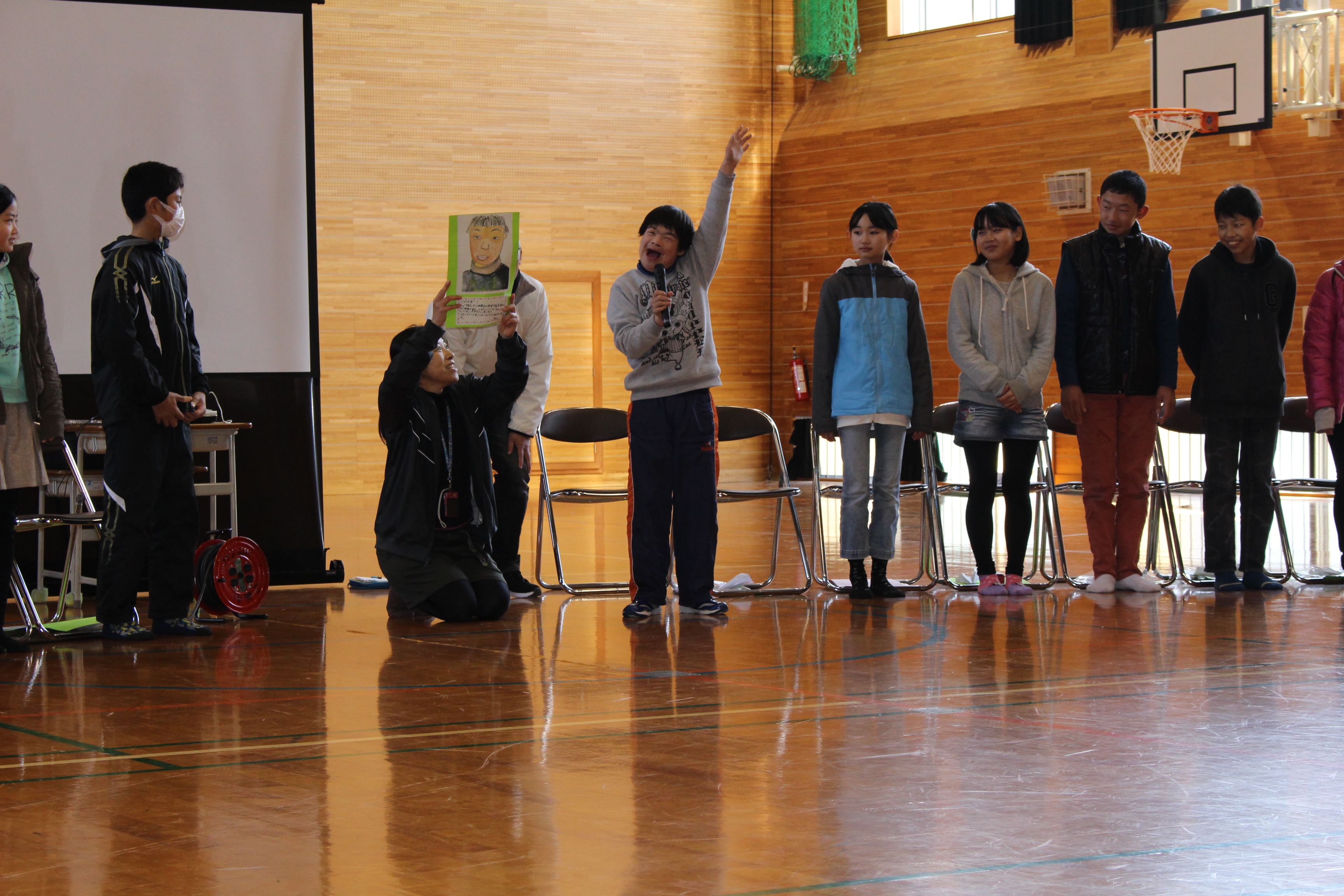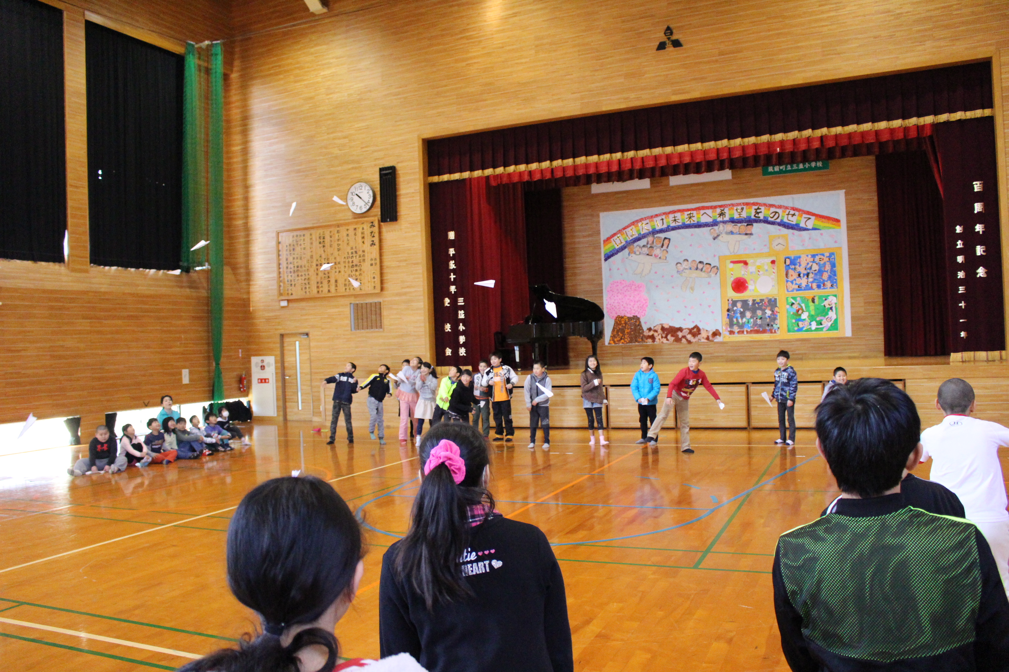 集会では5年生が企画、準備、当日の進行等を立派に努め、集会を作り上げてくれました。各学年が工夫した「出し物」を披露した後、6年生に感謝の気持ちや応援メッセージ、プレゼントを贈ったり、6年生が一人ずつメッセージを伝えたりしました。