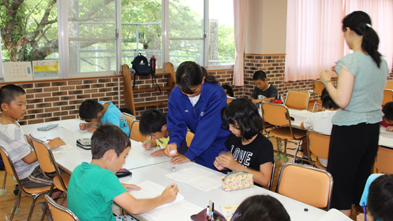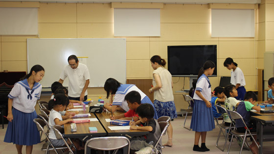 今年も夏休みに入り、サマースクールin三並、水泳クラブが始まりました。例年、中学生がボランティアで「先輩先生」としてお手伝いに来ていただいています。初日の学校長の話を真剣に聞く中学生に「自らも学ぼうとする」姿を感じました。
