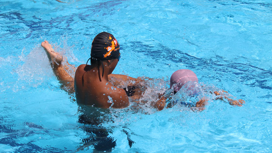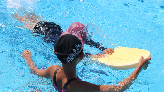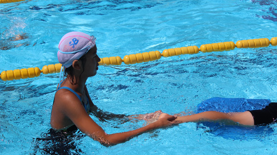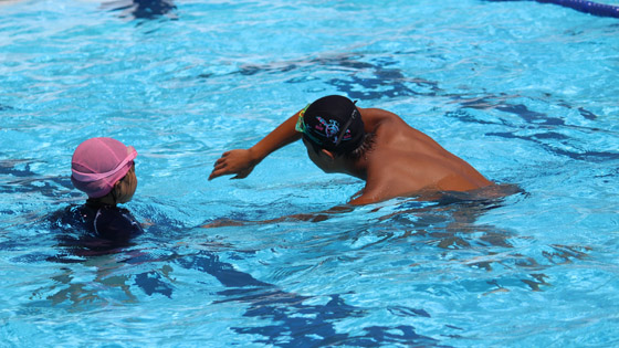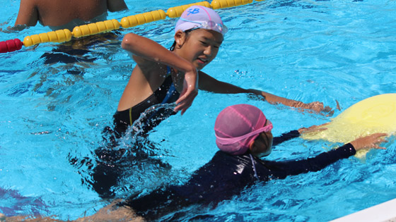 続いての水泳クラブでも水泳部の中学生が一人一人ていねいに教える姿が見られ、いつも以上に子ども達は真剣に練習していました。