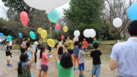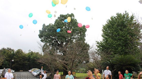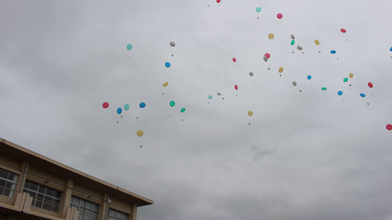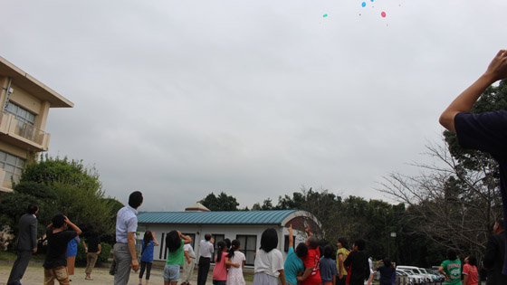当日は雨模様でしたので、閉会式の順番を変えまずは「風船飛ばし」を行いました。メッセージを書いた封筒に育てたひまわりの種を入れて飛ばしました。