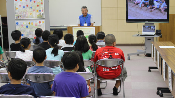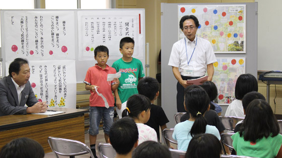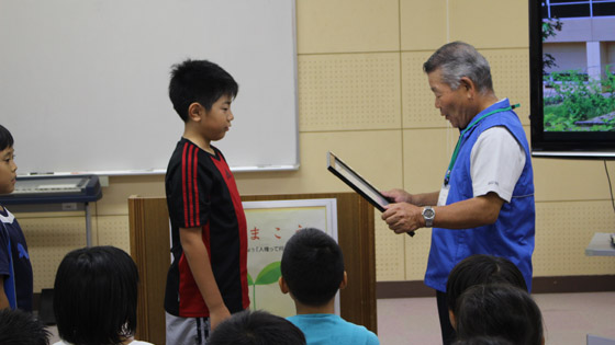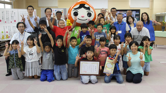 その後室内で、ご来賓からのあいさつ、子ども達の感想発表、感謝状・記念品贈呈と進み、最後に人権キャラクターの人KENまもる君と一緒に記念撮影を行いました。