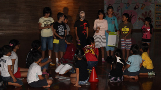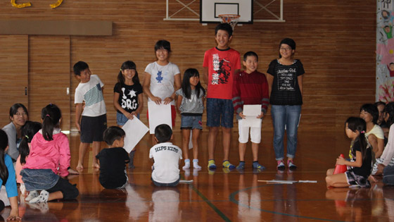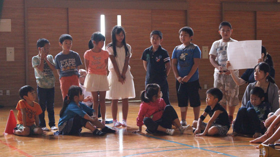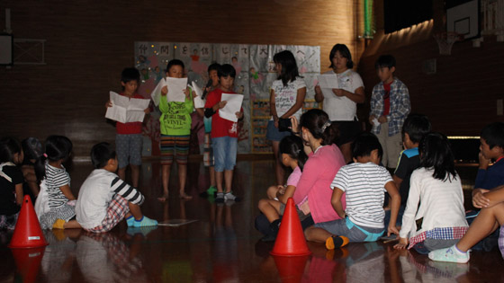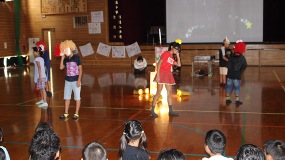 セカンドスクールが台風の影響で日帰りとなり、夜のキャンプファイヤーが残念ながらできませんでした。3年以上の子ども達は、キャンプファイヤーでの「各班の出し物」の練習を休み時間を返上して準備してきました。