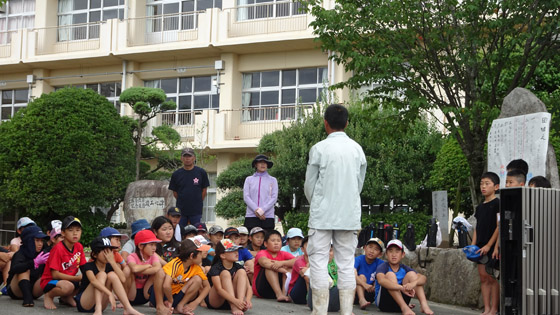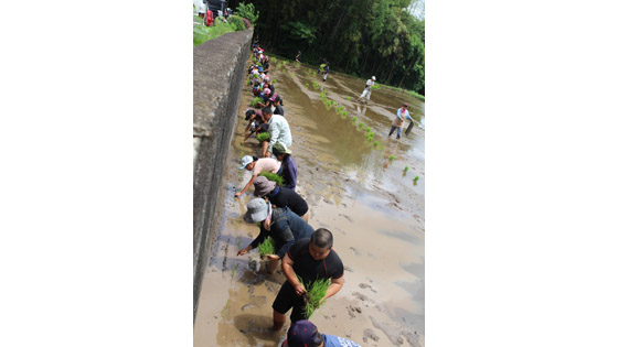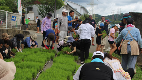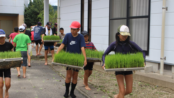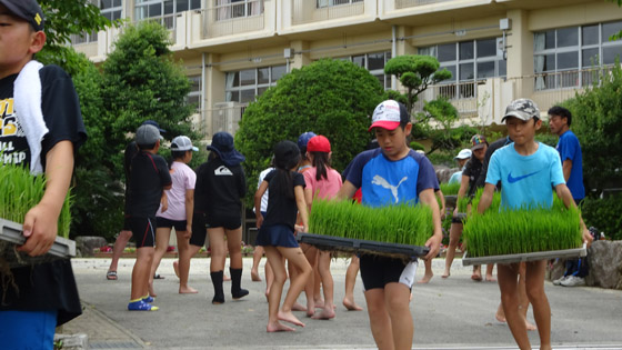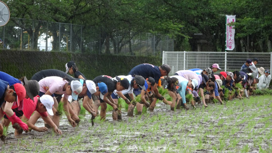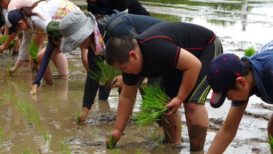 米作りの先生からのアドバイスを守り、5年生が一生懸命育てた苗を、来年米作りにチャレンジする4年生と昨年米作りを行った6年生にサポートしてもらいながら植えました。