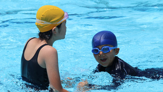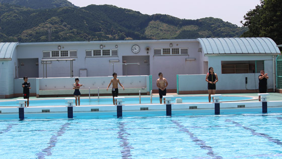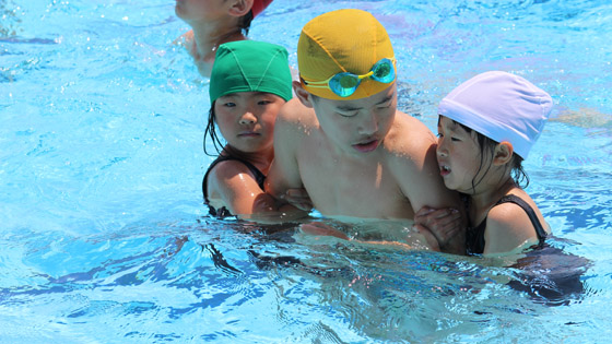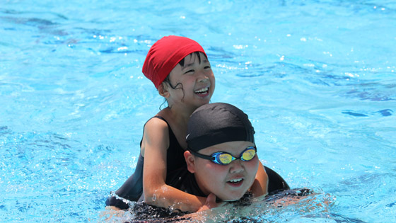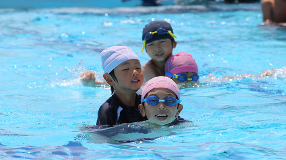 低学年は普段は入ることのできない大プールですが、この日は特別に上級生の背中に捕まりながら楽しむ低学年のうれしそうな表情が印象的でした!