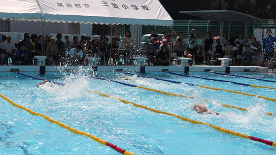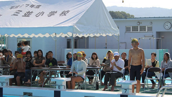 9月9日(土)、最高の水泳日和の中、三並小学校校内水泳記録会が開催されました。1年生から6年生まで全員が、今年の水泳学習で身に付けた力を発揮するためにワクワクドキドキしながら集合しました。