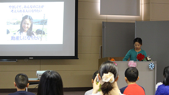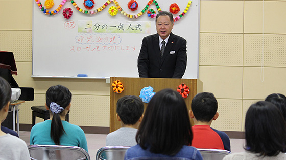 20歳の2分の1である10歳の子ども達が、堂々と将来の夢や決意を語ったり、家族への感謝の気持ちを伝えたりしました。これから未来へ羽ばたく子ども達が、優しく、たくましく成長している姿にとても感動した式となりました。
