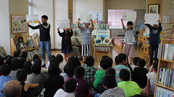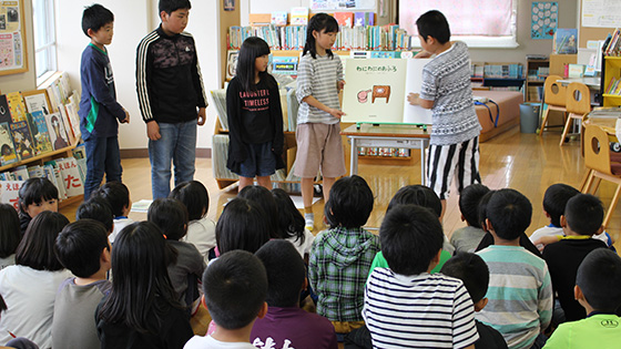 それに合わせて、図書委員会企画による大型絵本の読み聞かせや、おすすめの本の紹介などの「ミニお話会」が行いました。また、今年度より、三並小学校では、「筑前町子ども読書の日」でもある毎月23日を、「全校一斉借り換えの日」に設定しています。