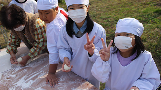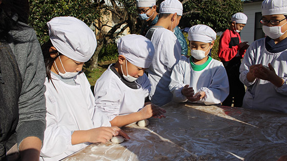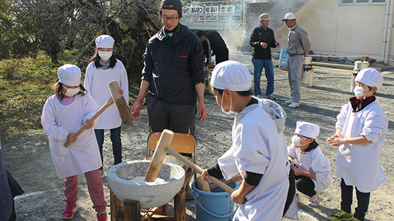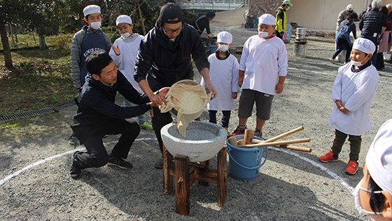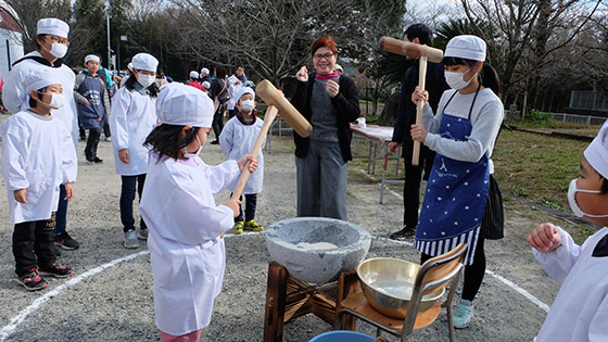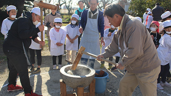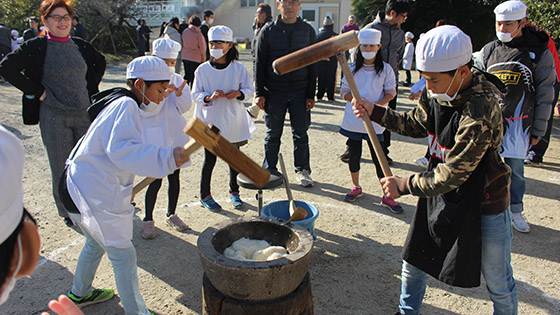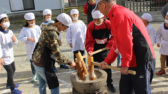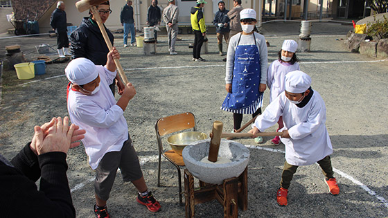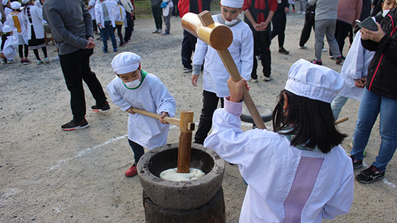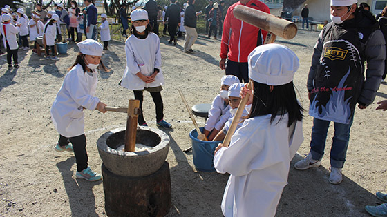 6年生にもなると、手慣れた様子で、力強くお餅をつく姿や、1年生のサポートをするほほえましい姿が見られました。