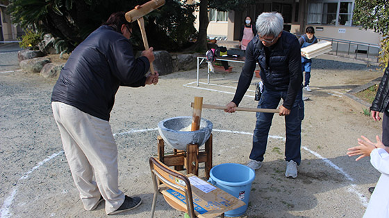 5年生が、前日に、重さをはかったり洗ったりして準備をしてくれた餅米を、保護者や地域のみなさまに協力していただきながら、たてわり班で協力してつきました。