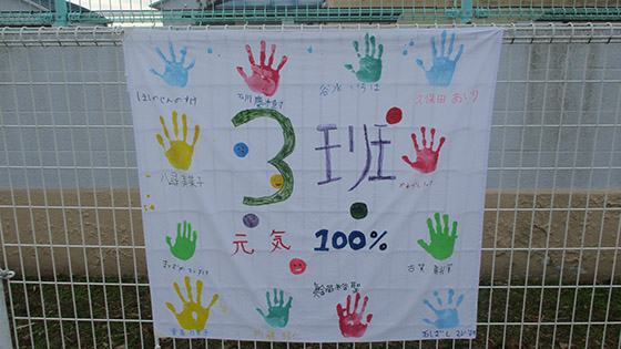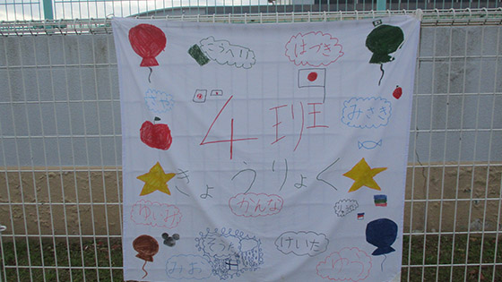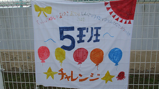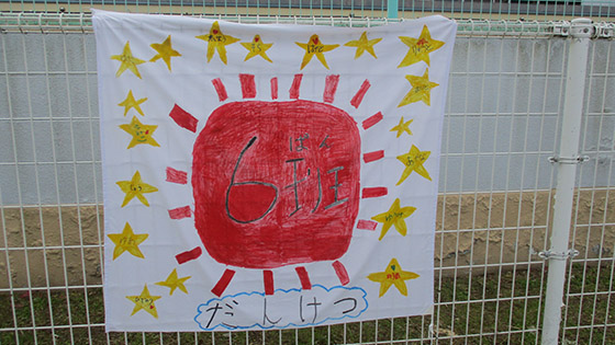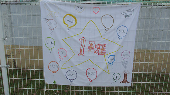少人数だからこそ、たてわり班での活動を大切にしている三並小です。今年は、セカンドスクールで作った班旗を飾りました。みんなでつなぐたすきには、班のメンバー一人ひとりの名前が書いてあります。