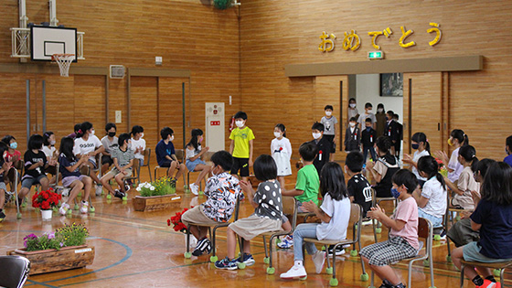 6年生に付き添われて、緊張気味で入場した1年生でしたが、担任から1人ずつ名前を呼ばれると、大きな声で返事をし、自分の好きなものの発表を堂々と行うことができました。また、1年生が「入学オリエンテーションでみんなに聞いてもらいたい!」と張り切って練習してきた詩を、堂々と披露することができました。