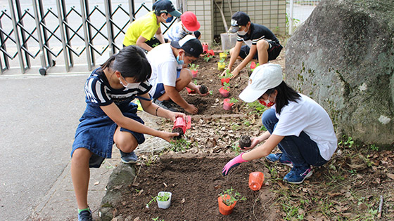 三並小学校では、子ども達が自分たちで学校をお花でいっぱいにする緑化活動に力を入れています。毎年、年に3回花植え活動を行っています。今年は、お互いに距離を保ちながらの作業でしたが、子ども達は、慣れた手つきで植えていき、あっという間に、前庭や玄関や花壇がお花でいっぱいになりました!