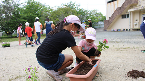 花苗植えが初めての1年生にも、6年生がやさしく丁寧に教えてくれたおかげで、上手に植えることができました。