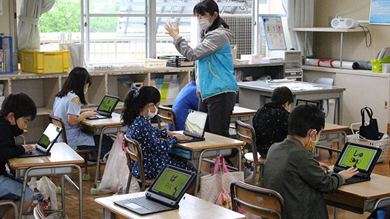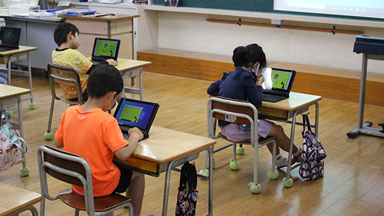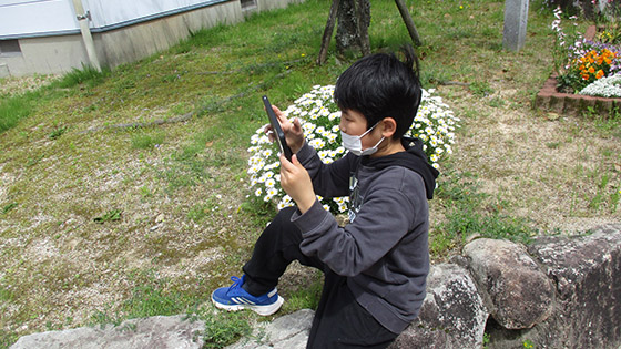 子どもたちは、あっという間に使い方を覚えて、インターネットを使っての調べ学習だけでなく、雲の動きの観察や、校区探検での写真撮影、植物の成長の観察、教科書についているQRコードを読み取っての音楽視聴や、図工の作品紹介カード作成など、様々な学習で、上手に使いこなす姿が見られています。