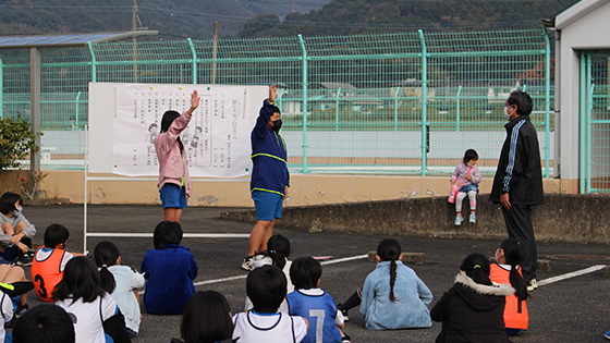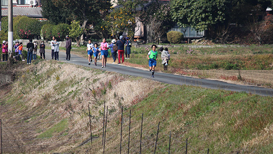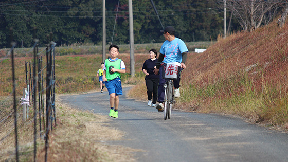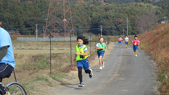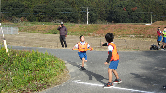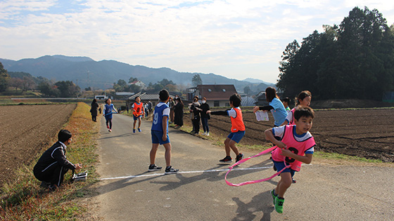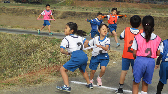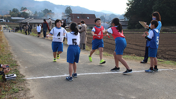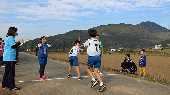 少人数だからこそ、たてわり班での活動を大切にしている三並小です。みんなでつなぐたすきには、班のメンバー一人ひとりの名前が書いてあります。駅伝大会でも、6年生を中心に、お互いに励まし合いながら取り組むことができ、どの班もリハーサルよりもぐっとタイムが縮まりました。