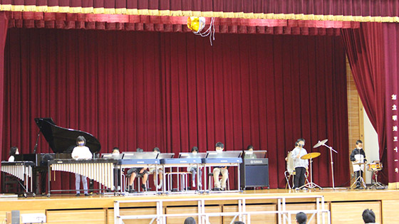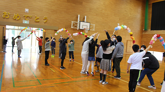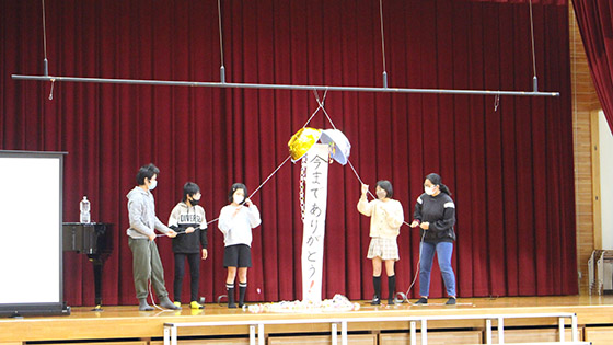 6年生からは先生クイズと「マルマルモリモリ」のダンスをしたあと、恒例のくす玉を開いてくれました。