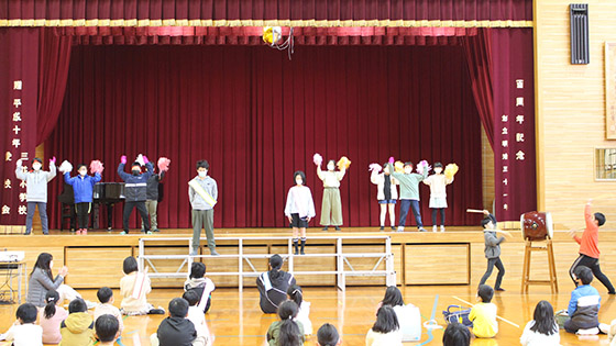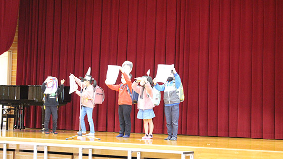 1年生は入学式からの6年生との思い出を劇にしました。2年生は、6年生へのメッセージと「にじ」の合奏をしました。3年生は「僕らまた」の歌とメッセージのプレゼントをしました。4年生は6年生一人一人へエールを送りました。5年生は6年生クイズをして、「Believe」の歌をうたいました。