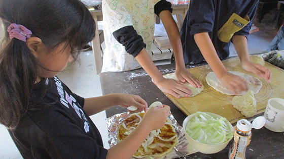 2日目の「クッキング」では、初めてのピザづくりに挑戦しました。上級生に教えてもらいながら、生地をこねたり、薪割りや火起こしをしたりと、たてわり班のメンバーで協力しながら取り組み、どの班もとてもおいしいピザができあがりました!みんなお腹いっぱいになりました。