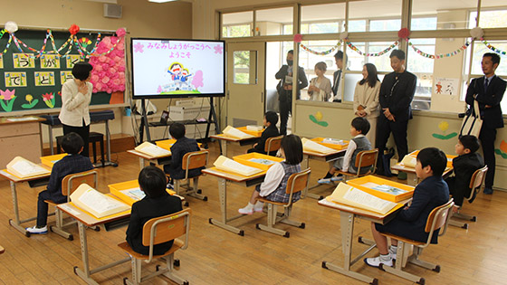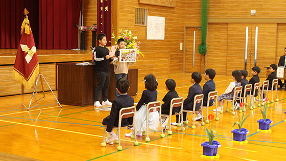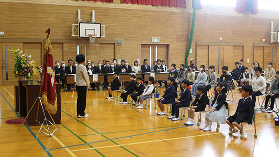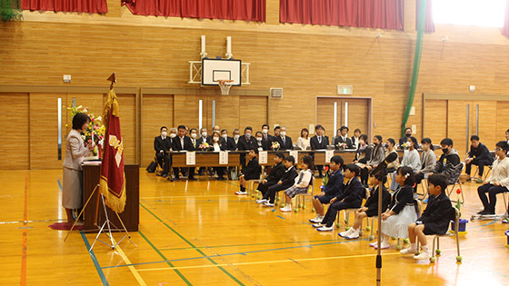 6年生と手をつなぎながら、 緊張気味で入場した1年生でしたが、 担任から一人ずつ名前を呼ばれると、大きな声で返事をすることができました。1年生の元気な姿と、 在校生代表の6年生の温かいサポートや歓迎の言葉で、 会場がとても明るくなりました!