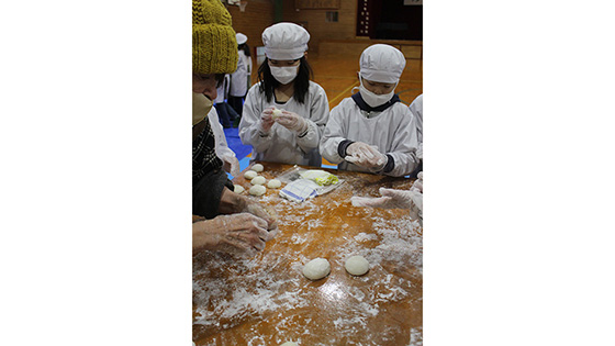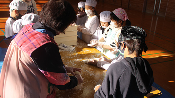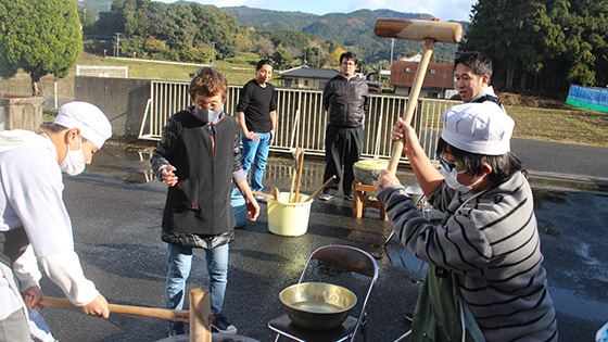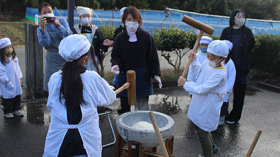 たくさんの保護者の皆様と、地域の皆様に教えていただきながら、子どもたちは、杵を握りしめて餅をついたり、出来上がった餅を丸めたりしました。