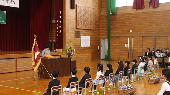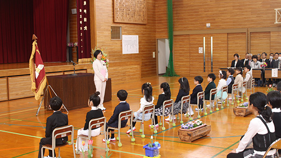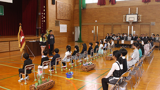 6年生と手をつなぎながら、緊張気味で入場した12名の1年生でしたが、担任から一人ずつ名前を呼ばれると、大きな声で返事をすることができました。