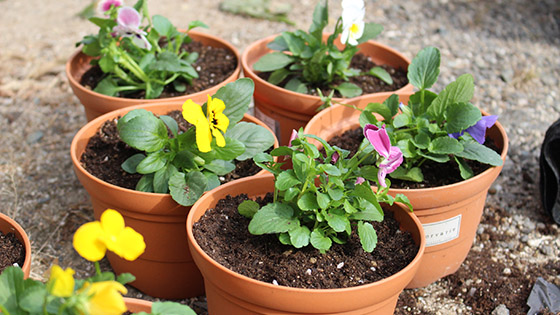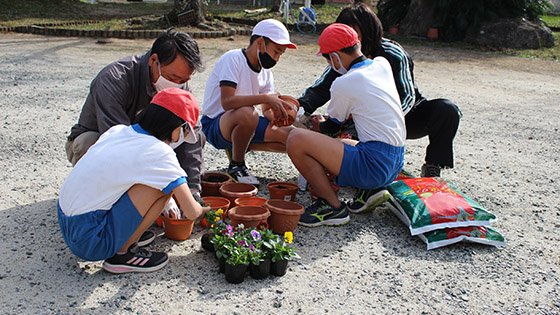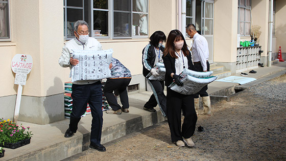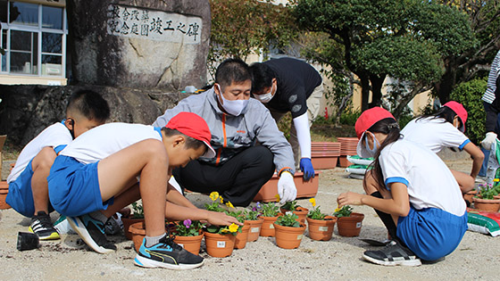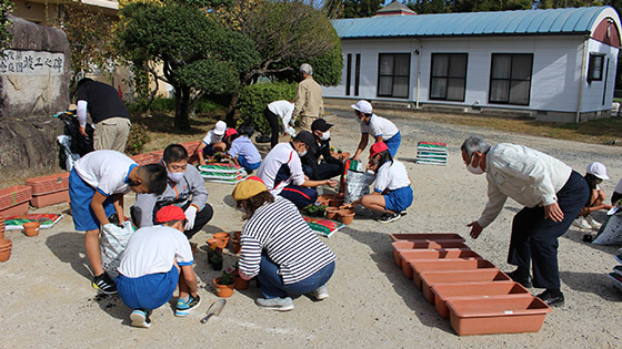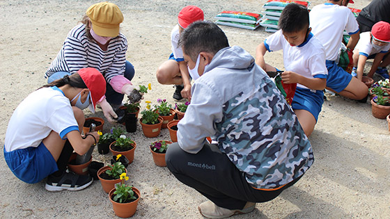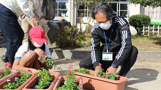 今年度も、学校運営協議会のみなさんと5、6年生で、地域の高齢者の方々へ贈るお花を植えました。