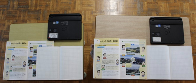 【昨年までの机と新しい机】 天板の大きい机を導入し、タブレットを活用しやすい環境で授業を行っています。 |