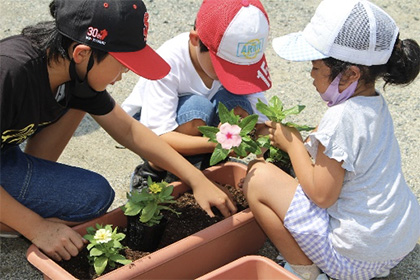 全校で花苗植えを行っています。上学年が下学年にやり方を丁寧に教えてくれます。 |
