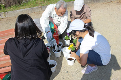 学校運営協議会の方と一緒に花苗植えを行い、学習発表会で参観された地域の方に配るようにしています。 |